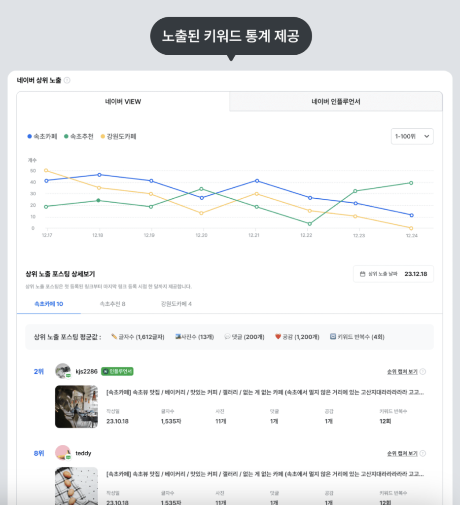 겉으로 보이는 인플루언서 배지만 믿을 것이 아니라 실제 데이터도 봐야 합니다. 태그바이를 활용하면 정교한 인플루언서 데이터(가짜 인플루언서 판별 등)분석으로, 배지 유무와 상관없이 해당 블로거의 영향력을 판단할 수 있습니다. 마케팅 활동 이후에 상위 노출에 대한 성과 분석도 자동으로 추적해 드립니다.